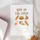 Cartão de convite para chás de fraldas bonito e moderno com ilustração aquosa de vários pães. Design neutro em termos de gênero. O texto diz "há um pão no forno."