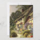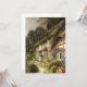 Ilustração arquitetônica vintage apresentando uma clássica casa de campo inglesa com telhado de palha e lindos jardins ingleses e uma mulher em pé ao lado dos degraus da frente. Poderia ser uma bela pousada rural.