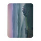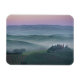 Fotografia retangular de souvenir com um nascer do sol embaçado com um céu cor-de-rosa e névoa entre as colinas toscanas sobre agriturismo podere il Belvedere, na fazenda de Valdorcia (Vale de Orcia), entre Pienza e San Quirico, na Toscana, Itália.