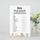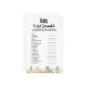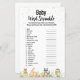Procurando o jogo perfeito para adicionar charme e diversão ao seu chá de fraldas? Apresentando o nosso "Bebê Traits Palavra Escramble"! Este jogo é adorado com animais lindos da floresta. CHAVE DE RESPOSTA: 1.Crib 2.Mamãe 3.Fralda 4.Leite 5.Mudança De Mat 6.Carsat 7.Cadeirante 8.Urso de película 9.Pacificador 10.Loção 11.Livro 12.Jogar Caneta 13.Pijama de pés 14.Fórmula 15.Fralda Bag 16.Porte de bebê 17.Placa addle 18.Bottle 19.Toalha encapotada 20. Bovinos