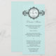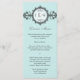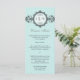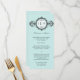 Um cartão de menu que tira sua influência da era Art Deco. Uma banda ornamentado, parecida com um relógio vitoriano, apresenta um medalhão segurando o monograma do casal. O fundo aqua pálido impressão um padrão sutil como uma marca d'água. Adicione ou reduza o espaço entre a primeira e a última iniciais para equilibrar com o monograma central. Adicione um menu personalizado abaixo. Um olhar clássico para estabelecer o clima para qualquer casamento. Disponível em cores alternativas com produtos correspondentes.