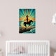 A mesmerizing graphic interpretation of a sunset ride. Featuring a bold silhouette of a cowgirl on horseback, this artwork utilizes high-contrast teal, orange, and gold to create a rhythmic, geometric ocean and sky. A stylized crown-like sunburst rises from the horizon, casting a golden glow over the patterned sand and rolling waves. A sophisticated choice for contemporary coastal or Western-themed homes.