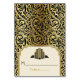 Edifícios de abstrato de Art Deco preto, cartazes dobrados de casamento dourados com cartaz com edifícios abstrato e uma fronteira no estilo Art Deco e damask preto e ouro. Seu texto está em um quadro bege/ecru. Este elegante design é uma abordagem moderna a um estilo vintage/retro que se assemelha ao estilo Roaring 20 e The Excelente Gatsby. Faz parte de um casamento e é completamente personalizável. Dobre-o ao longo da linha pontilhada para ter uma placa de lugar dobrada no estilo da tenda. Alguns elementos são cortesia de All-Free-Download.com