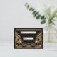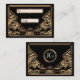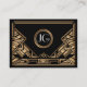 Um cartão de lugar de casamento ousado e elegante, estilo vintage, ou um cartão de escolta com um tema "Gatsby Excelente" de vinte e poucos anos em tons de preto e ouro. Um fundo preto destaca a intrincada borda geométrica do estilo Art Deco em tons bege ouro. Quadros decorativos e fontes de estilo de período foram selecionados. Os monogramas da noiva e do noivo podem ser adicionados numa cor de cinza prateada contrastante no verso do cartão.