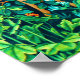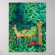 Impressão em um design de cervo de tapeçaria Art Nouveau num cenário de floresta de fantasia - veado bronzeado num fundo azul e verde de folhas e flores, acentuado com tulipas vermelhas