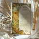 Elevem seu dia especial com a elegância eterno da nossa Cartãozinha de Nouveau, inspirada em Arte, ecoando perfeitamente o estilo icônico de Alphonse Mucha. Este cardápio é uma obra-prima de cores harmoniosas e linhas sinuosas, capturando a essência do movimento artístico da virada do século que celebrava a beleza em todas as formas. A carta apresenta uma delicada paleta de ouro, esmeralda e marfim, acentuada por sutis tons de pêssego, verde-marinho e siena queimada. No centro, uma mulher graciosa, lembrando as figuras etéreas de Mucha, se reclina em meio a um ornamentado de matizes giratórios e folhagem intrincada. Esta carta não é apenas um cardápio, é uma peça de arte que encantará seus convidados e servirá de guardiã de seus queridos momentos.