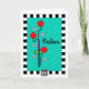 O vermelho brilhante dentro das faixas pretas e brancas das flores do nouveau de arte contrasta fortemente com o fundo vívido e rodeado de folhas de xadrez de búfalo. O cartão interior tem a área de encontros e fronteiras e é adorado com o mesmo motivo floral para o seu prazer escrevendo. Shalom! ~ karyn