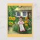 paisagem nacional-étnica ucraniana. Uma mulher gentil contra o fundo de uma casa ucraniana, onde galinhas correm e girassóis crescem. Um presente interessante, gentil e engraçado sobre o tema ucraniano. Um presente para todos da Ucrânia com amor.