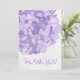 Cartões de nota artísticos. A design floral tem uma grande lavanda de flor de hydrangea roxa na frente com texto de "obrigado você". Adicione um monograma inicial ao verso e escreva uma nota pessoal.
