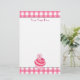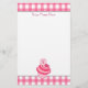 Artigos de papelaria que caracterizam uma beira cor-de-rosa do guingão através da parte superior e da parte inferior. Personalize com seu nome na parte superior. Ilustração de um cupcake da framboesa no fundo. Personalize a letra no chapéu de coco do cupcake com sua inicial.