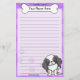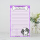 Artigos de papelaria coloridos de Chin do japonês de Kawaii com um cão preto e branco dos desenhos animados no canto direito mais baixo. A parcela superior pode imediatamente ser personalizada com seu nome dentro do osso grande do cachorrinho. O fundo da beira e do papel é roxo.
