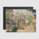 Flor de Árvore de Ameixa, Eragny. Camille Pissarro. Paisagem primavera em cores quentes. O jardim perto da casa está cercado por uma cerca alta. No centro há uma árvore florida. Uma mulher está caminhando pela estrada. Reprodução de famosas imagens de arte no dominio público.