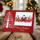 Personalize a elegante Árvore de Natal Branco no Cartão de Saudação de Foto de Natal Vermelho com seu próprio nome e foto da família. Sinta-se livre para alterar o texto, a fonte e a cor de fundo de acordo com as suas necessidades. Este cartões de fotos de Natal clássico apresenta um intrincado e festivo design de árvore branca de Natal em fundo vermelho. Disponível como cartão impresso para envio por correio ou como download digital para fácil compartilhamento digital online.