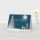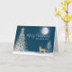 Pinheiro branco de Natal com sinos de ouro, veados e pássaros vestindo cachecol de inverno. Azul-céu noturno e camada de floco de neve com lua de cheio para Feliz Natal e feliz ano novo. O texto é editável.