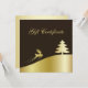 Ilustração elegante de Natal em ouro, com uma silhueta de ouro de renas e árvores com Feliz Natal em fundo castanho.