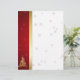 Ilustração de Natal moderna, elegante e festiva, com uma árvore de Natal feita de estrelas brilhantes sobre fundo vermelho com flocos de neve e ouro.