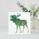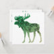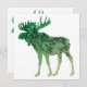 Esta design é o contorno de um alce com um gradiente de cor verde a bege e e a silhueta de um dentro de árvore.