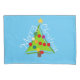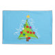 Feliz Natal em lindas fontes brancas encaracoladas ao lado de uma bonito árvore de Natal verde com ornamentos vermelhos. Belo fundo azul. Um presente fofo bonito.