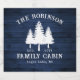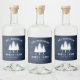 Um país de na moda rústico rústico com o conjunto de rótulos de garrafas e garrafas de comida, com o seu nome e "Cabina de Família", Ranch, Cottage ou outro texto, juntamente com a sua data e localização estabelecidas, se desejado. Este design personalizado, único, apresenta texto no estilo do país rústico com uma silhueta branca de pinheiros em um impressão de tábuas de madeira em cores azuis ricas. Para ver mais designs como esta, sinta-se à vontade para visitar a minha loja aqui em "Zazzle.com/Rustic_Charm". Obrigados.