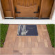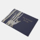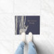 Convidando porta em azul-ardósia escuro, com gráficos de uma árvore semitransparente e veado. Texto personalizado alto pode ser personalizado para ler o que você deseja.
