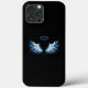 Asas claras, artísticas, de anjo azul sobre fundo preto. Asas de anjo.