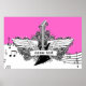 Guitarra branca preta com asas poster impressão, apresentando uma guitarra elétrica, asas, chamas e espirros em pentagrama de música, notas e clave tripla em fundo rosa quente. Um presente de excelente para um músico, guitarrista ou amante.