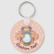 Um velho feiticeiro com capa rosa olhando para a bola mágica de cristal. Texto personalizado de ambos os lados.