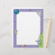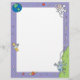 Esta bela cartola apresenta uma fronteira azul com planetas, a Terra, satélites e um astronauta amarrado a um módulo lunar na Lua.