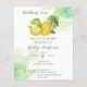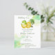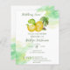 Odiando em breve um dinossauro bebê verde-aquarela em um convite para chá de fraldas de orçamento de ovo amarelo. Temas verdes, neutros em relação ao gênero, fáceis de pegar e combinar com a decoração.