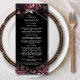 Elevem a sua recepção de casamento com o encantador fascínio do nosso Menu "Morte até a Altura" Preto Escuro Negro, Elegante Floral. Deixe o design requintado definir o tom para uma experiência de jantar verdadeiramente inesquecível. Descubra a fusão perfeita de romance gótico e estética elegante. Elevem o seu casamento... ordenem agora e façam seus menus de casamento banquete pelos sentidos!