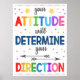 SUA ATITUDE IRÁ DETERMINAR SUA DIREÇÃO! Faça os alunos pensarem com esta poster de tipografia falsa e atenciosa. Uma sala de aula de na moda e excelente, escritório principal, escritório da assistente social ou poster de escritório de assessoria para desafiar os estudantes a terem uma atitude positiva! Um poster excelente para pendurar em uma escola secundária, sala de aula de segundo grau ou escritório escolar de qualquer tipo! Excelente poster para assessores de orientação escolar, consultórios de carreira, diretoria, terapeutas ou psicólogos para lembrar as crianças de uma atitude positiva!