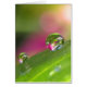 A fotografia macro bonita, vibrante de gotas de água em uma folha pequena, refracting floresce no fundo.