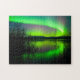 Aurora boreal espelhada na superfície calma do lago Laberge, território yukon, Canadá