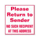 Este simples design de carimbo apresenta as mensagens "Please Return to Sender" (Devolva ao remetente) e "NO THERE RECIPIENT AT This ENDDRESS" (NÃO SE DESTINA A ESTE ENDEREÇO). Pode ser utilizado para indicar que o correio postal recebido pode ter sido incorretamente endereçado e deve ser devolvido ao remetente.