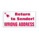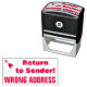 Este design de carimbo apresenta as mensagens "Return to Sender!" e "WRONG ADDRESS", juntamente com um símbolo de seta decorativa. Pode ser utilizado para indicar que o correio postal recebido foi entregue no endereço errado e deve ser devolvido ao remetente.