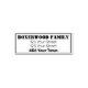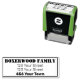 Um carimbo de endereço de retorno ligeiramente masculino, incluindo 4 linhas: Nome (família ou pessoa), rua 1, rua 2, cidade. A fonte é fácil de ler, mas pode ser personalizada, facilmente.
