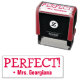 Este design de carimbo positivo apresenta a mensagem motivadora "PERFECT!" e o nome de um professor personalizado. Ele poderia ser usado por um professor, educador, ou tutor ao marcar trabalhos, para reconhecer que o aluno fez bem.