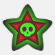 Este adesivo único do crânio tem um crânio brilhante verde colocado no centro de uma estrela vermelha rubi que brilha também e está ela própria colocado em um adesivo de estrela preto. Um design de aparência muito legal, com certeza para agradar como um presente ou decoração de halloween ou para aqueles que gostam de moda gótico.