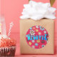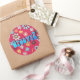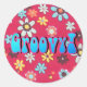 Adesivo redondo com a palavra-chave "Groovy!" dos anos 60 numa imagem antiga dos anos 60 de flores amarelas, azuis, laranja e roxas brancas em vermelho. Veja a mala de favor correspondente, caixa de favor, etiqueta de favor e rótulo. Veja toda a coleção Psychedelic 60s Sticker nos CONVITES | Seção Stickers & Labels