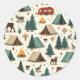 É um adesivo com uma foto de uma árvore, uma barraca, e uma fogueira.