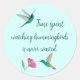Um autocolante bonito para amantes de beija-flores, apresentando um beija-flor de rabo-rufo e um beija-flor violeta, e a citação "O tempo passado assistindo beija-flores nunca é desperdiçado". Imagem e citação de Christiane Dobbins.