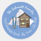 Um charmoso chalé de madeira azul em frente a uma montanha com um par de esqui ao lado. Personalize esses adesivos de endereço de retorno com seu nome de família e endereço usando o modelo fornecido. © ArianeC Ilustrações — Todos os direitos reservados