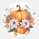 O adesivo é mostrado na redonda com uma adorável impressão floral de abóbora de abóbora. Personalize este item ou comprar como está. Imagem licenciada