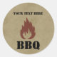 Estes adesivos são perfeitos para o CHURRASCO da empresa ou para os sindicatos da família! Ele apresenta um fundo de textura de papel vestido com uma ilustração de chama no topo. Acima da chama há uma área para você adicionar o nome da sua empresa, o nome da família ou qualquer outro texto que possa ter. Abaixo da chama estão as letras "CHURRASCO" em texto em negrito.