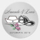 Chapéu de enfermeira e capacete de bombeiro com número de estação do bombeiro. Fundo prateado com rosas cor-de-rosa e verde. Por baixo mostra o nome do casal em uma bela fonte e data de casamento. Posso personalizar facilmente esta design para o casamento.
