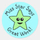 Uma estrela de animação verde feliz. O texto diz "Miss Star Says Excelente Work!" e pode ser alterado para um nome/mensagem personalizado. Ideal para professores como recompensas para estudantes.