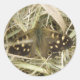 Esta espantosa folha de autocolantes redondos apresenta uma fotografia de uma espécie de borboleta britânica chamada "Speckled Wood (Pararge aegeria)". A borboleta está sentada no chão. Ela tem as asas parcialmente abertas revelando os pontos de vista e as bonito marcas marrom e branco que dão o nome à espécie.