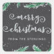 Vinhetas personalizadas de "Feliz Natal" com neve brilhante em galhos de pínus e um fundo chic chalkboard. Personalize com seu próprio nome de família. Perfeito para decoração de presente, selos de envelope para cartões de Natal ou decorações de favor numa festa de Natal. [Nota - os elementos deste design serão impressão para se parecerem com brilho, mas não há brilho real na placa.]