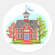 Os edifícios escolares vêm em todos os estilos. Este design é um prédio de escola legal que é um velho pequeno tipo de chalé. O prédio parece bonito e tem uma torre de sino no topo do telhado. Esta design de prédio da escola parece excelente nesses adesivos. Perfeito para si mesmo ou como presente