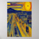 Carro dirigindo na autoestrada na cidade, céu colorido, sol amarelo e uma montanha ao fundo no estilo de Edvard Munch. Esta é uma arte gerada por IA.